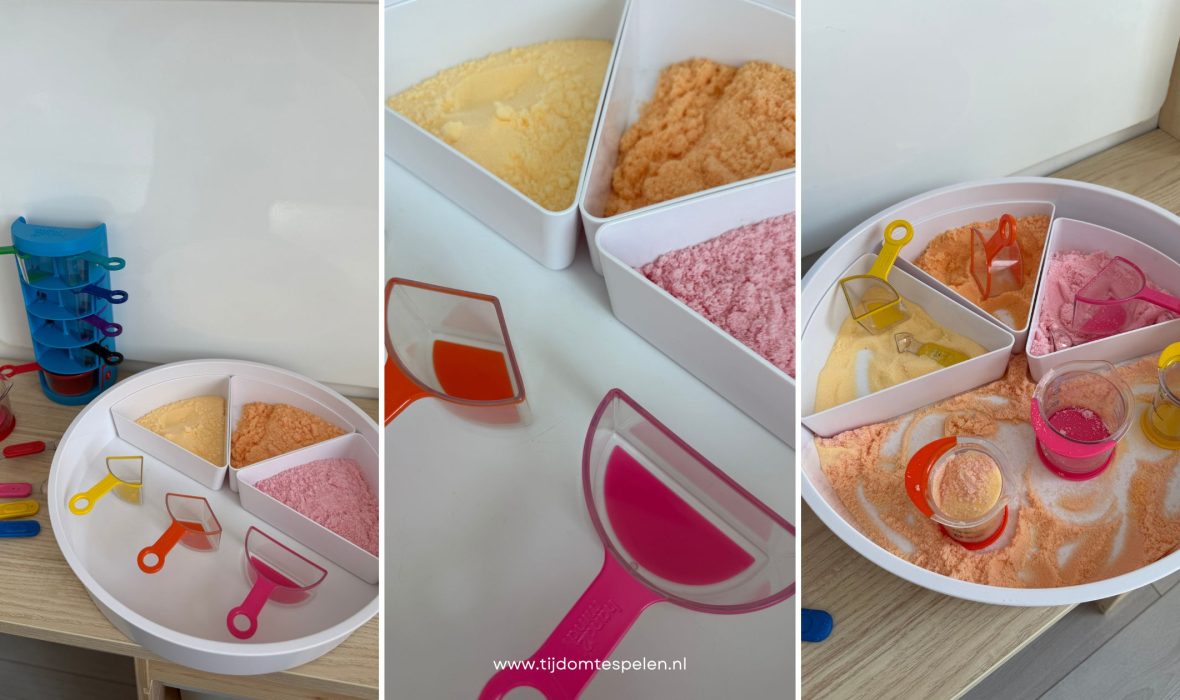 Voor deze setup gebruikte ik zelfgekleurd speelzout in drie kleuren (een beetje zout, een beetje voedingskleurstof, even mengen en goed aan de lucht laten drogen) én drie handige educatieve sets van ToyAcademy.nl: