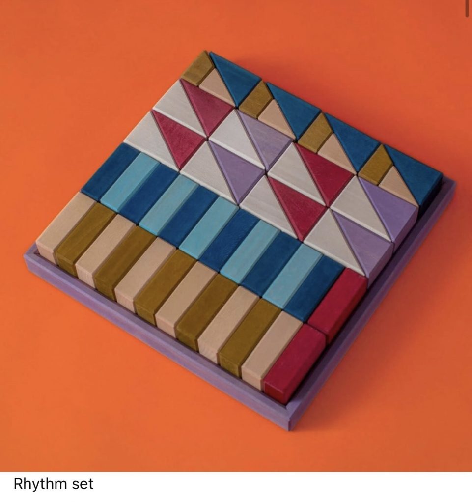 Grimms Rhythm is een bouwset die uitnodigt om te schuiven, te stapelen en opnieuw te ordenen. De vormen zijn geometrisch en strak, maar worden speels door de kleinere onderdelen die de rechte lijnen doorbreken. Juist dat maakt deze set zo leuk.