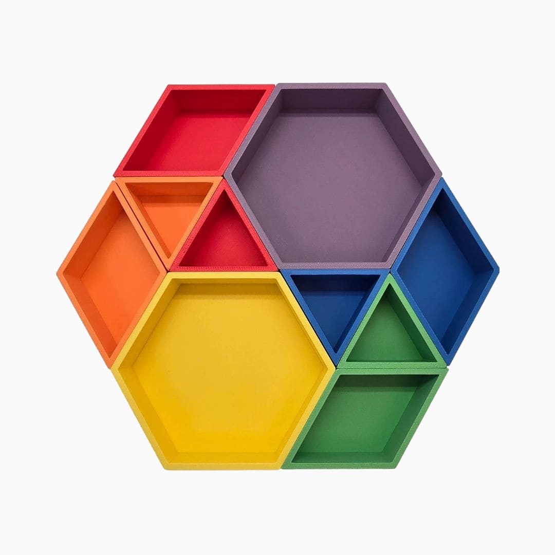 Ben je op zoek naar Grennn speelbakjes startersset regenboog-klein? Deze speelbakjes set is een leuke uitbreiding op het magic sand of speelrijst van Grennn. De set bestaat uit twee zeshoeken, 4 ruiten en 4 gelijkzijdige driehoeken in vrolijke regenboogkleuren. De verschillende kleuren nodigen uit om materialen, zoals loose parts te sorteren, te rangschikken en patronen te leggen. Ook kunnen kinderen de speelbakjes vullen met kinetisch zand om heerlijke taartjes te bakken. Kortom! Fantastisch open einde speelgoed dat fantasierijk spel stimuleert! Specificaties speelbakjesset mix * Merk: Grennn * Leeftijd: 3+ jaar * Materiaal: plantaardig, biologisch afbreekbaar plastic * Afmeting: * speelbakje ruit: 8,5 (l) x 4,7 (b) x 2,4 (h) cm * speelbakje zeshoek: 8,6 (l) x 11 (b) x 2,4 (h)cm * speelbakje gelijkzijdige driehoek: 4,1 (l) x 4,9 (b) x 2,4 (h) cm * Inhoud verpakking: 4 ruitvormige speelbakjes, 2 zeshoekige speelbakjes en 4 gelijkzijdige driehoekvormige speelbakjes * Schoonmaken: afspoelen met lauwwarm water