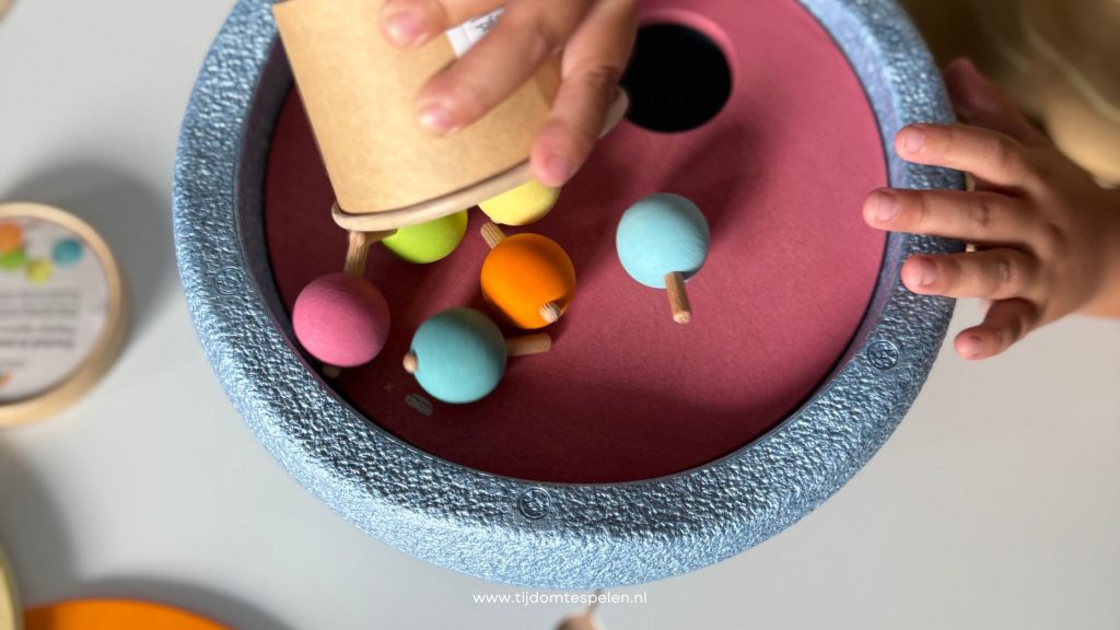 Een setje discs komt met drie platen, met drie groottes qua gaten en drie verschillende balletjes. Klein, medium en groot. Omdat de tollen van Grimm’s zo groot zijn als het medium balletje, kun je twee discs gebruiken om de tol door het gat te laten vallen: medium en groot. Volg je me nog? Bekijk anders vooral de video hieronder!