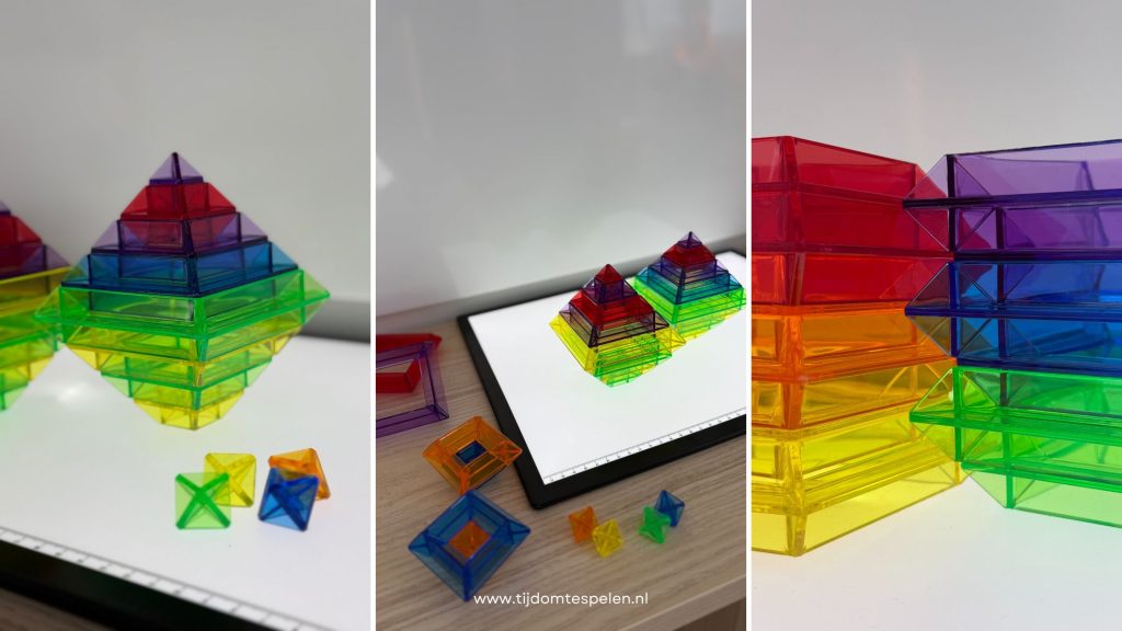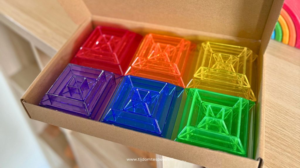Heb je een lichttafel in huis? Dan moet je deze echt eens combineren met de kleurpiramides. De kleuren komen tot leven en je kind ziet meteen hoe licht en kleur met elkaar spelen. Geen lichttafel? Ook voor het raam of met een zaklampje krijg je een mooi effect.