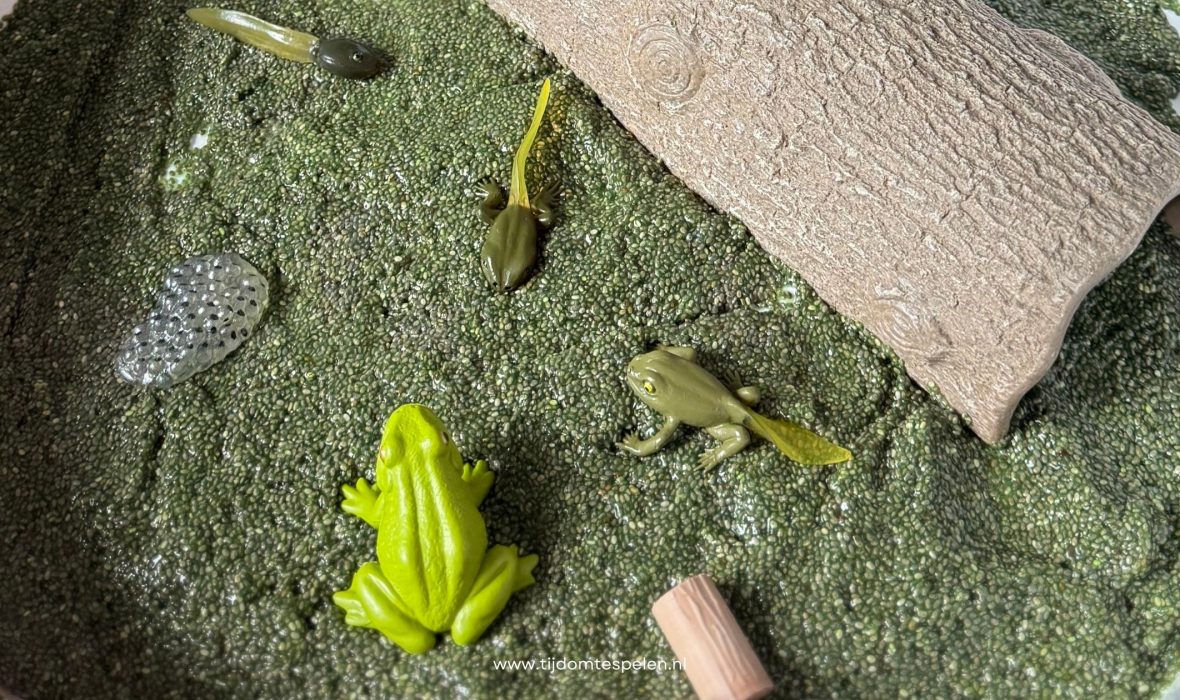 Gebruik laminaatkaartjes met afbeeldingen van de kikkerlevenscyclus (ei, kikkervisje, pootjes, volwassen kikker). Laat je kind de juiste volgorde leggen of de stadia zoeken in de speelbak. Tip: met een loep erbij wordt het bijna een mini-wetenschappelijk experiment.