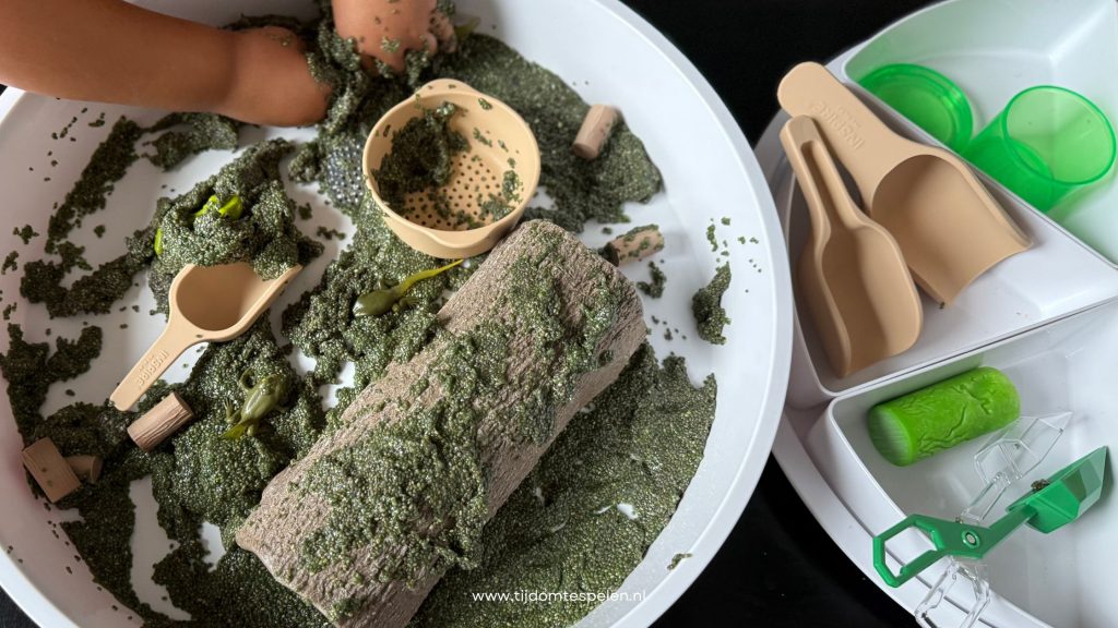 Laat kinderen hun vingers erin stoppen, erin knijpen, roeren of uitscheppen met een lepel. De structuur is heerlijk vreemd. Een fijne manier om sensorische prikkels te verkennen, vooral voor kinderen die graag voelen, ontdekken en experimenteren. Hier hoef je dus nog niet eens een thema set-up voor te maken. Enkel de ‘kikkerdril’ is genoeg.